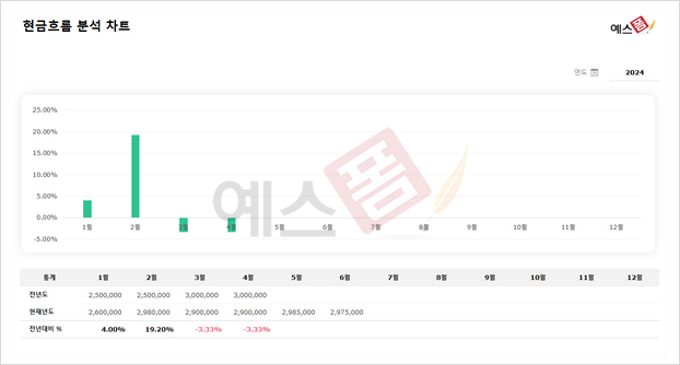 현금 수입과 지출 내역을 통해 현금흐름 차트 통계를 확인할 수 있으며, 구글 시트로도 사용이 가능한 예스폼 현금흐름표 양식을 아래 내용에서 다양한 양식들과 함께 확인해 보시고, 재무 관리하는 데 있어서 많은 도움 받아보시길 바랍니다!
