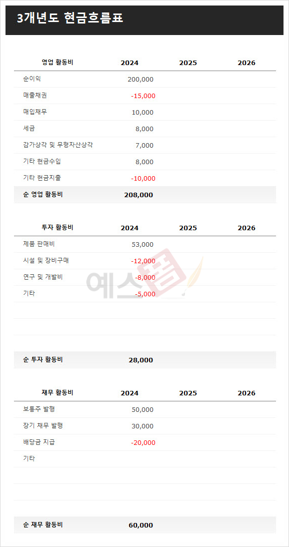 기업의 현금 흐름을 주요 활동인 운영, 투자, 재무 활동으로 나누어 3년 동안의 현금 유입과 유출을 기록한 3개년도 현금흐름표 템플릿입니다.