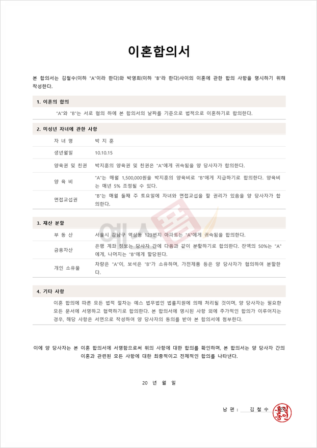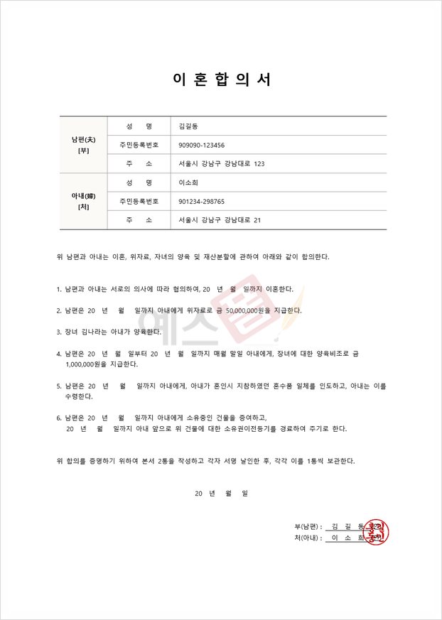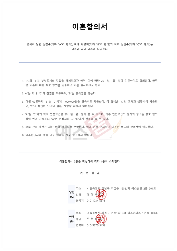 하지만 많은 사람들이 이혼 합의서 작성에 어려움을 겪습니다. 복잡한 법률 용어와 절차는 혼란스럽고, 어떤 내용을 담아야 할지 막막하기 때문인데요. 오늘은 예스폼에서 협의 이혼 절차 및 합의 내용과 이번에 새로 업데이트된 이혼 합의서 양식을 추천드릴 예정이오니 이 글을 통해 여러분의 이혼 과정이 조금 더 편리하고 긍정적인 방향으로 흘러가기를 바라겠습니다.