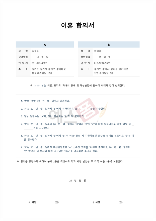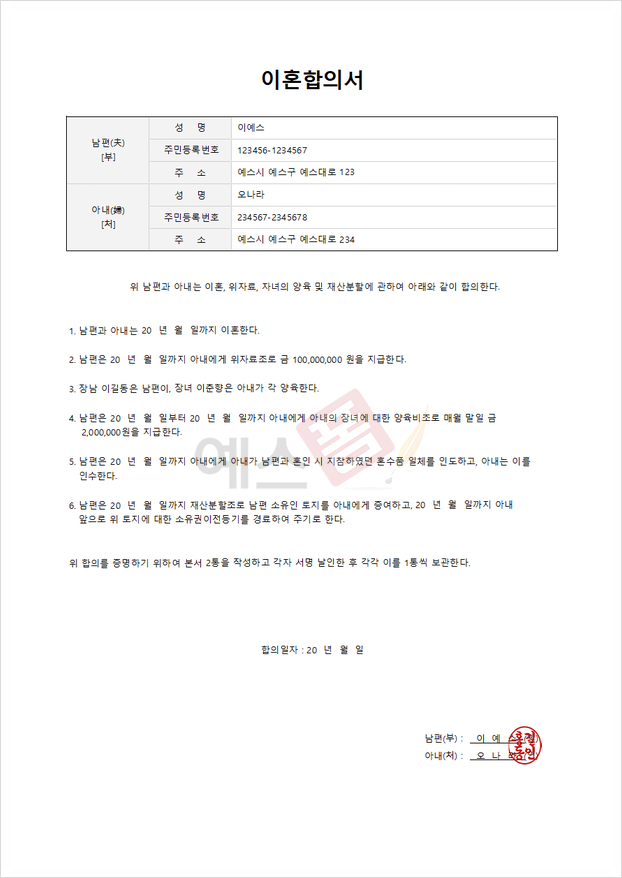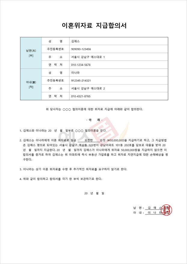| 이혼 합의에 관한 합의사항을 명확하게 기재하고자 할 때 사용되는 이혼 합의서 양식입니다. 이혼의 시기, 위자료 및 재산분할, 친권 및 양육자 지정, 면접교섭권 등을 명시할 수 있습니다. 특정 부부의 이혼 합의가 예시로 포함되어 있습니다. |