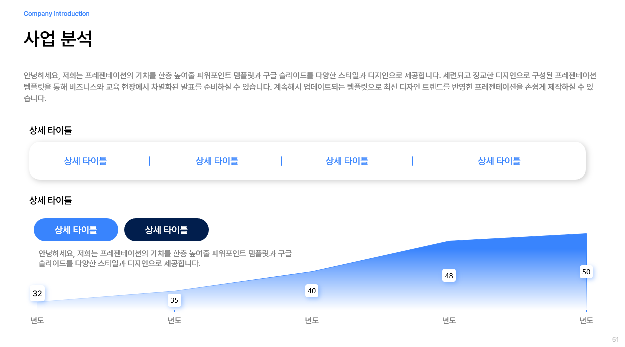 - 전 산업군 활용 가능: IT, 제조, 유통, 교육 등 다양한 업종에서 범용적으로 쓸 수 있는 슬라이드 구성