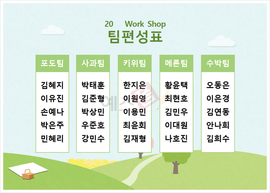 | 워크샵 휴무안내문 | 워크숍 팀 편성표 | 워크샵 일정표 |