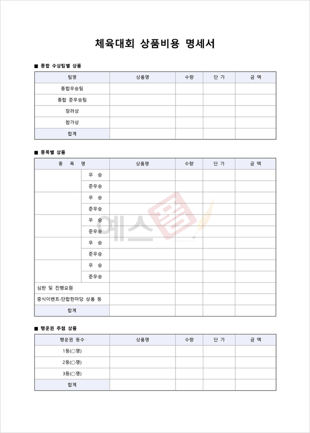 | 체육대회 기획안 | 체육대회 참가인원 및 단체티 주문표 | 체육대회 상품비용 명세서 |