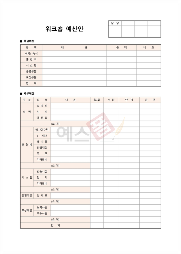 | 워크샵 기획안 | 워크숍 예산안 | 워크샵 비용 예산표 |