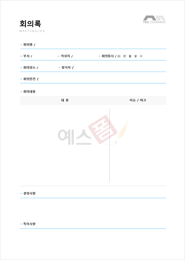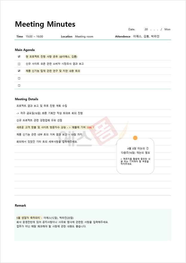 회의 정보 : 회의 날짜, 시간, 장소, 참석자 목록을 기록합니다.