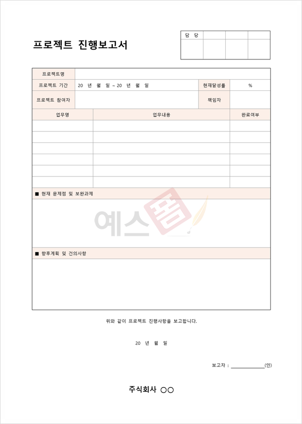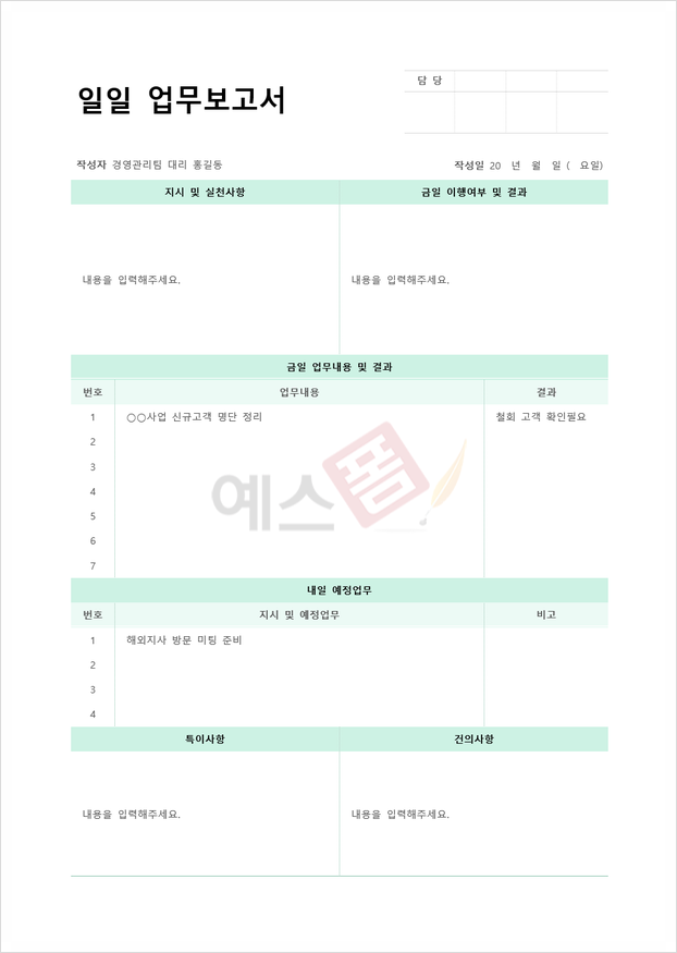 문제점 및 해결 방안 : 업무 진행 중 발생한 문제점과 제안된 해결 방안을 기술합니다.