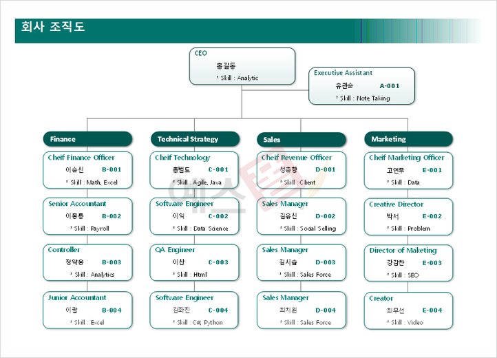 조직도와 함께 각 부서별 임직원 정보를 확인할 수 있는 회사 조직도입니다. 대표이사 정보, 부서 정보, 직원 정보를 직위, 성명, Skills과 함께 입력하면 자동으로 조직도에 표시되도록 구성되어