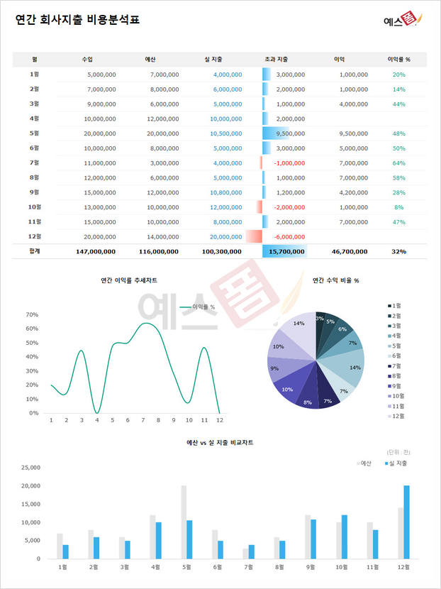 회사의 연간 수입, 지출 내역을 입력하여 이익률을 확인할 수 있는 연간 회사 지출 비용분석표 템플릿입니다. 입력된 내역을 바탕으로 차트 통계가 자동 생성되어 사업 운영비 분석 및 예산 수립이나 비용 절감 전략 수립에 도움이 됩니다.