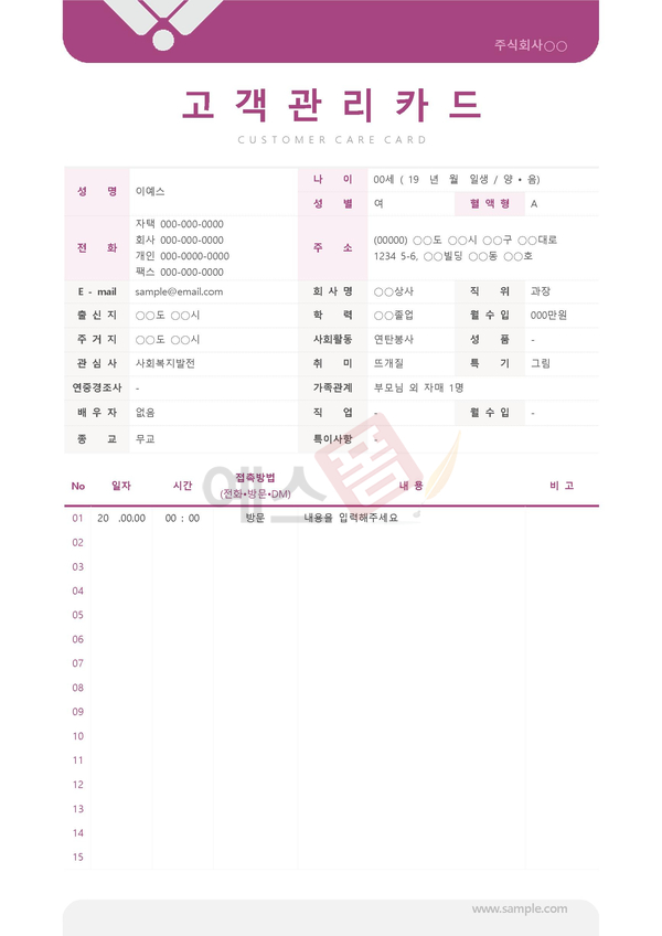 기업이 고객과의 상호작용을 효율적으로 관리하고 문서화하기 위해 사용하는 양식 모음입니다. 주로 고객정보를 수집하고 관리하는 데 사용하거나, 고객과의 소통 기록을 기록하는 데 활용하실 수 있습니다.