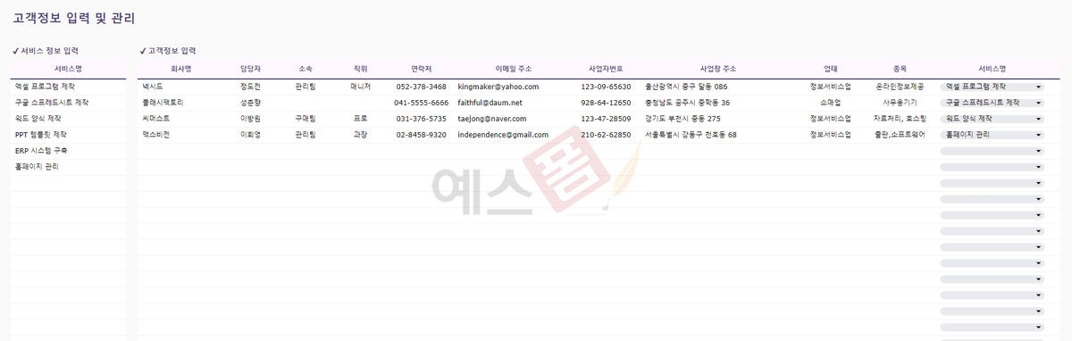 고객별로 대행하는 서비스 항목을 설정하고 담당자명, 연락처, 이메일 주소 등 고객정보를 기입하실 수 있는 시트입니다.