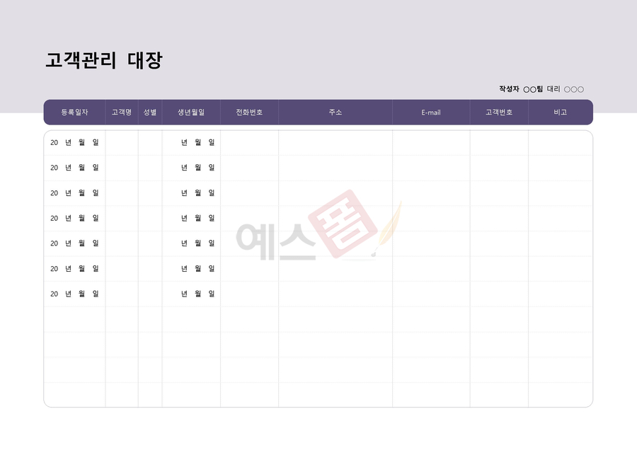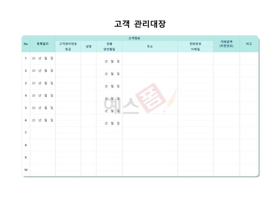 기업이 고객과의 상호작용을 관리하고 효과적으로 추적하기 위해 사용되는 고객관리대장(CRM) 템플릿입니다. 아래 서식을 활용하셔서 고객과의 관계를 효과적으로 관리하고 개인화된 서비스를 제공할 수 있습니다.