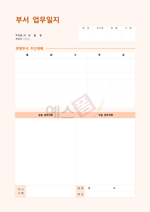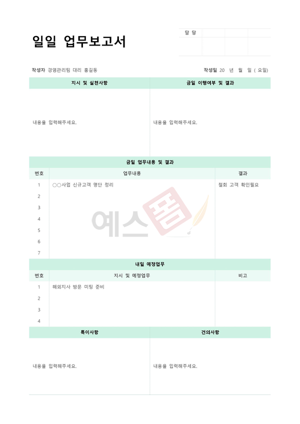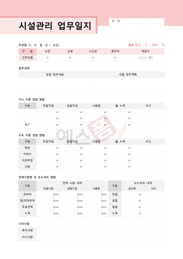 일일 업무보고서 (지시 및 실천사항) | 부서 업무일지 | 시설관리 업무일지 |