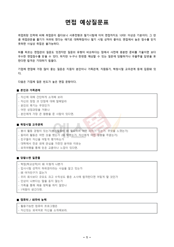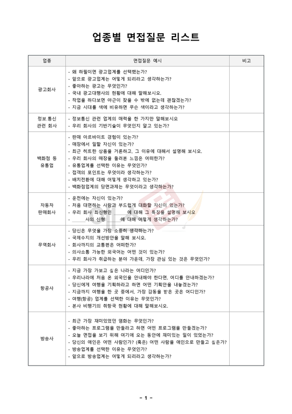 | 면접 예상질문표 | 업종별 면접질문 리스트 | 면접 기초자료표 |