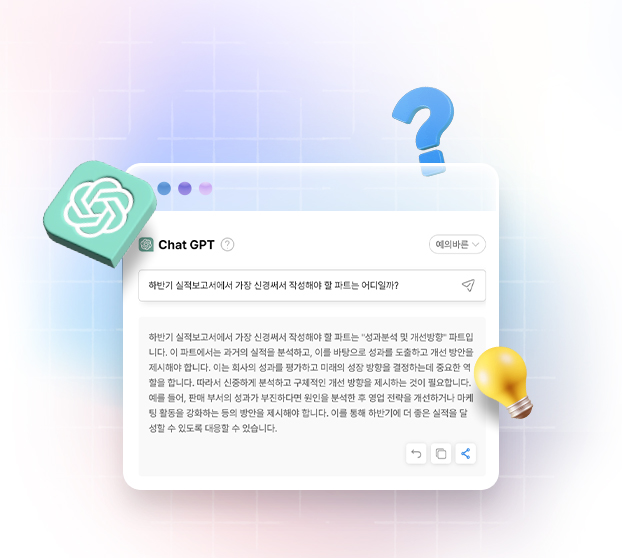 Chat GPT는 질문에 즉각적으로 반응해 가장 적합한 결과물을 똑똑하게 추천해 줘요.