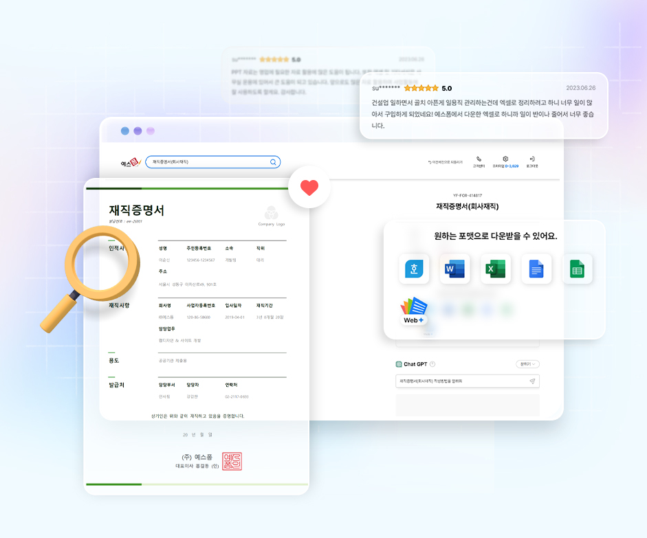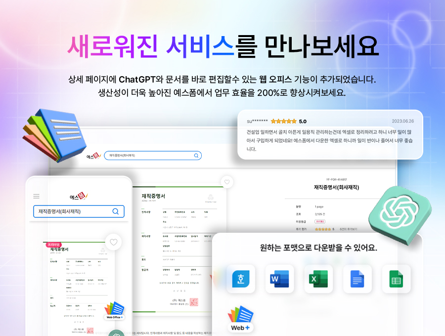 사용 후기 이미지 역시 커졌으며 한눈에 각 문서/서식 정보, 사용자들의 사용 후기를 볼 수 있어요.