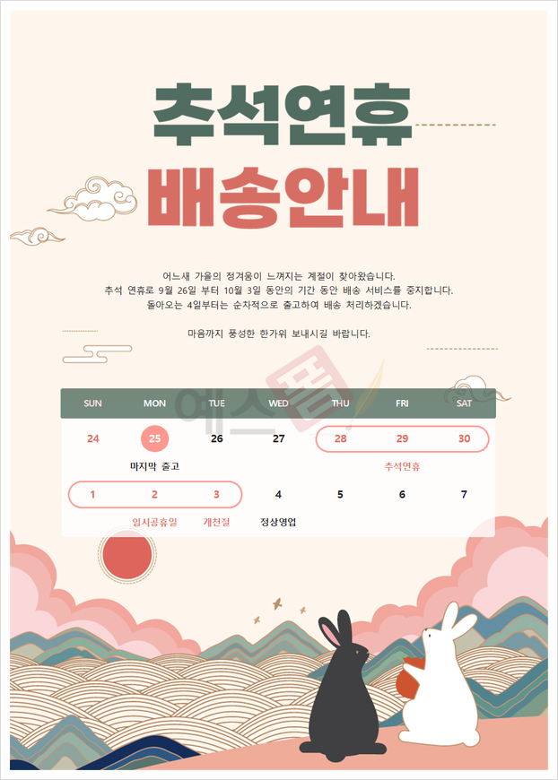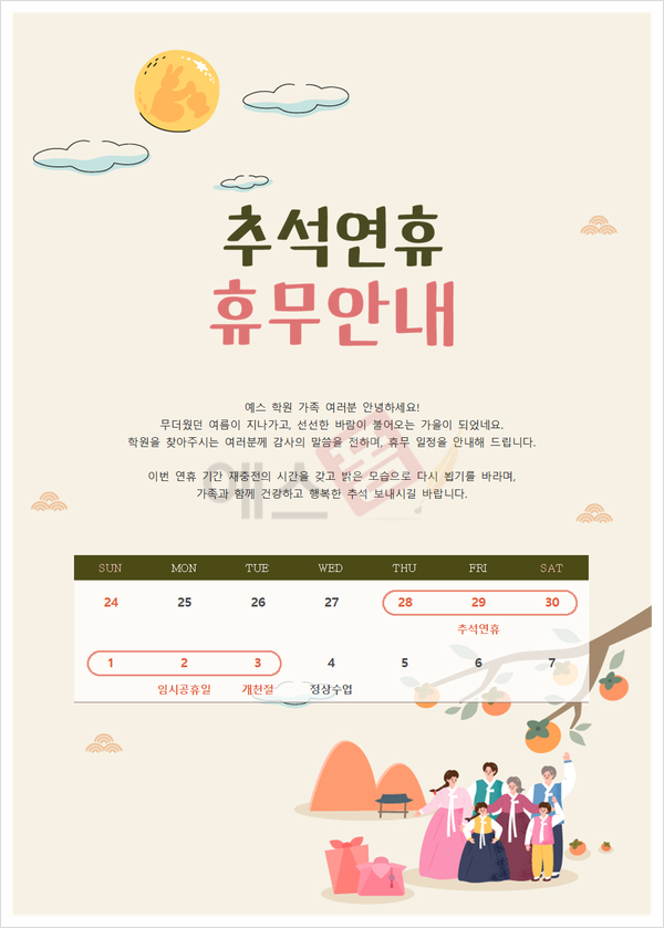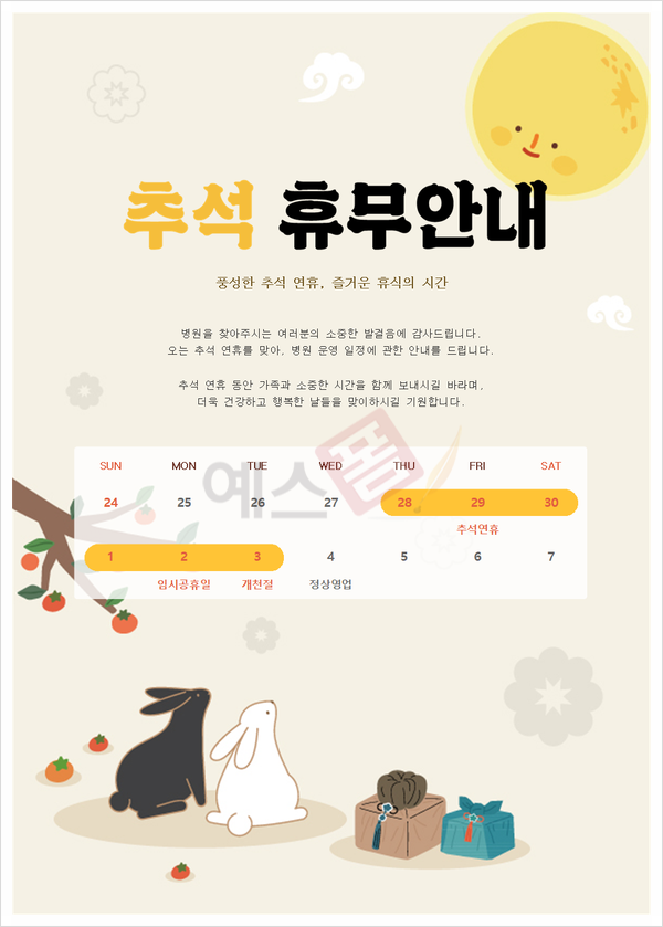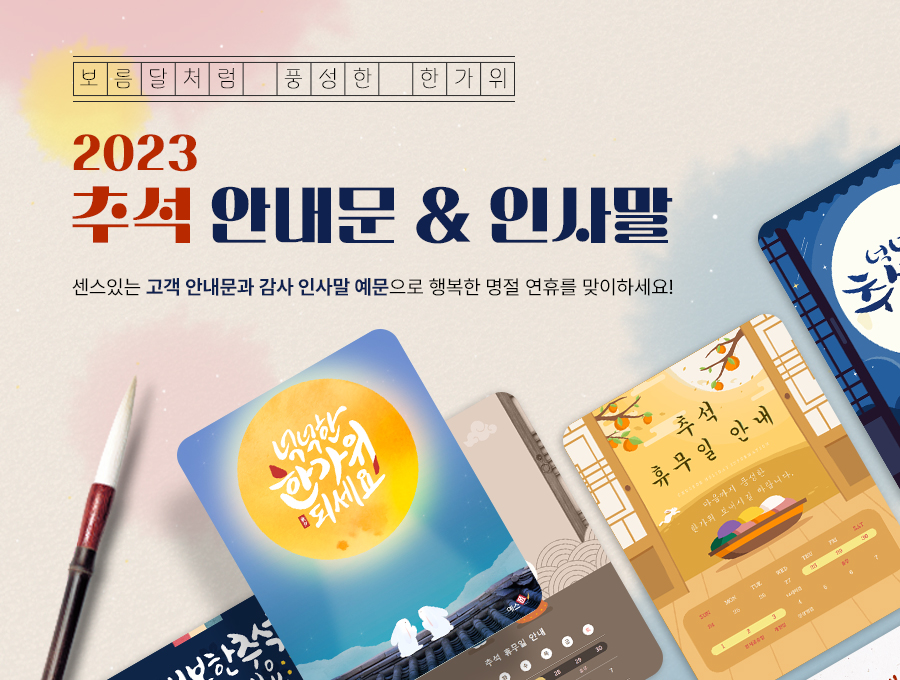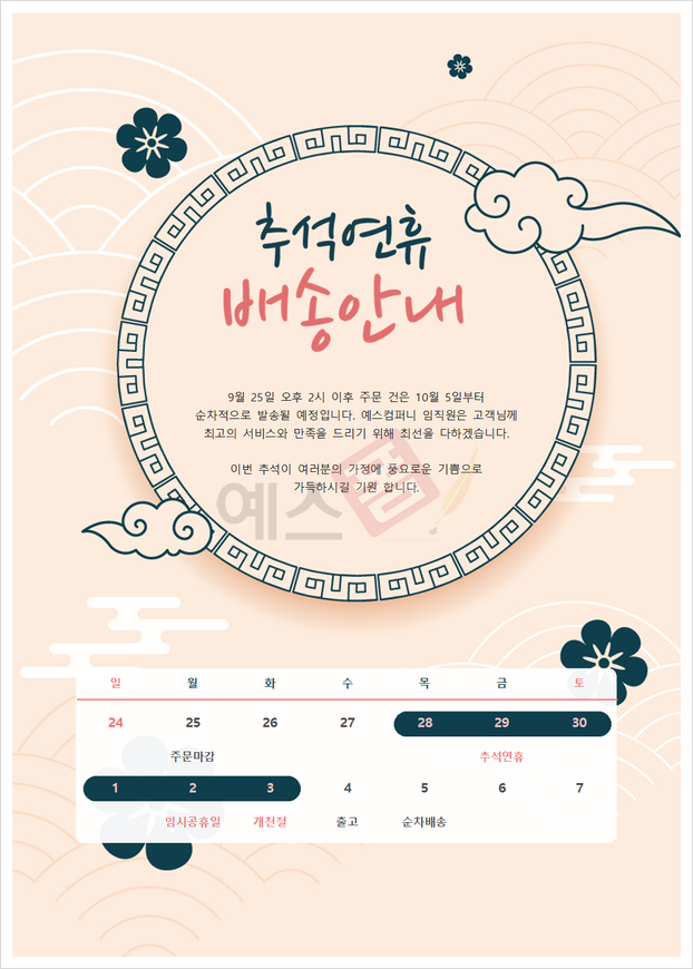 오늘은 예스폼에서 행복한 한가위 연휴를 맞이하기 전에 미리 준비해두면 좋은 추석 휴무안내문, 배송안내문과 추석 인사말 예문을 준비해 보았는데요.