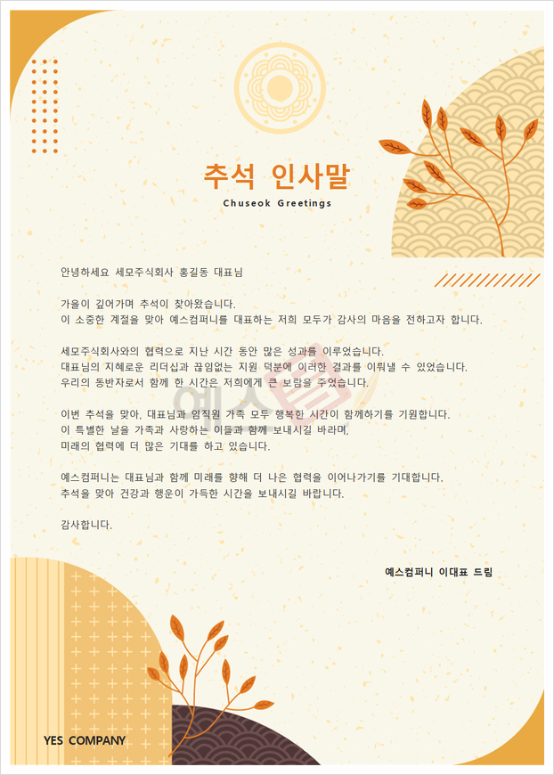 오늘은 추석 연휴를 맞이하여 넉넉하고 풍요로운 한가위를 기원하는 추석 인사말과 센스있는 인사말 카드, 그리고 추석 휴무 안내문, 배송 안내문 양식을 알아보았습니다. 오늘 소개해드린 양식 이외에도 추석과 관련된 다양한 문서/서식들이 예스폼에서 서비스되고 있으니 아래 링크를 통해 더 많은 자료를 만나보시기 바랍니다.