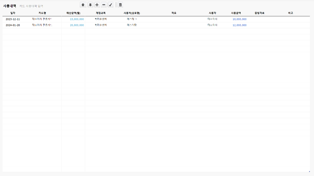 법인카드사용내역에 관한 거래 내용을 기록할 수 있습니다. 일자별, 카드명, 사용한 계정과목 및 사용금액을 기재합니다. 이러한 세부사항의 입력을 통해 거래내역의 정확성을 높이며, 기업의 재무 상태 관리에 필수적인 데이터를 제공합니다. 유효성 검사를 통해 자동으로 카드명과 계정과목을 입력할 수 있어, 사용자의 실수를 줄이고 빠르고 정확한 데이터 입력이 가능합니다.