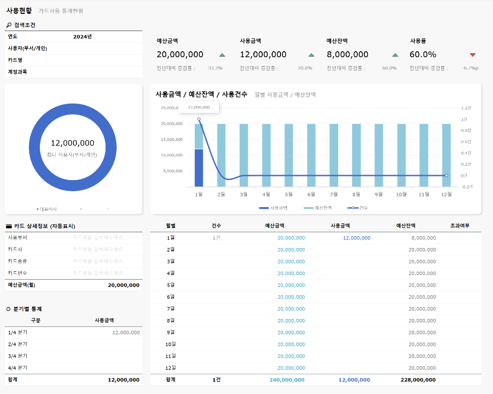 법인카드 사용 관련 데이터를 토대로 다양한 통계와 현황을 분석할 수 있습니다. 검색조건을 연도, 사용자, 카드명, 계정과목 중 선택하여 입력하고 카드명을 입력하면 카드 상세 검색을 할 수 있습니다. 카드 사용내역에 대한 결과를 차트로 제공합니다. 월별통계와 분기별 통계를 포함해 전년도 대비 증감률을 비교할 수 있습니다. 또한 검색조건에 따라 상위 사용자, 지출과목, 사용 카드 등의 정보가 차트에 자동으로 표시됩니다.