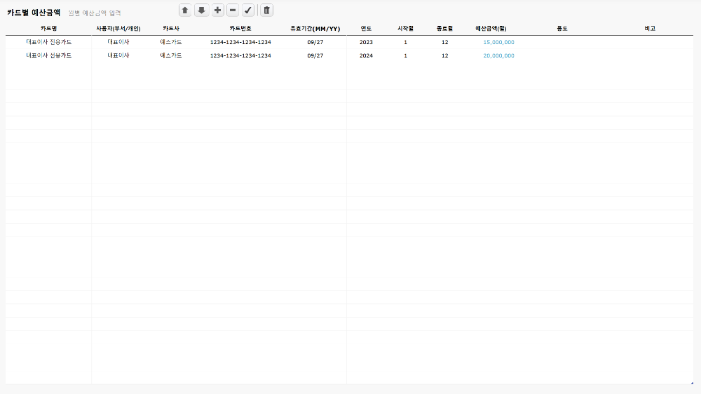 각 카드별 예산 산정 기간을 입력하여 관리할 수 있습니다. 연도, 시작월, 종료월을 입력하고 이를 통해 특정 기간 동안의 카드 사용 예산을 계획하고 이를 관리하는 데 중점을 둡니다. 카드별로 달라질 수 있는 예산액을 기간별로 구분하여 관리함으로써, 예산 초과 사용을 방지하고 법인 재정 건전성을 유지하는 데 도움을 주는 시트입니다. 같은 카드인 경우에도 예산 기간에 따라 카드별 예산금액을 다르게 입력할 수 있습니다.