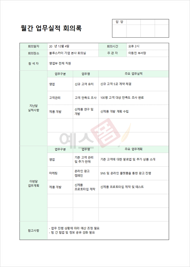 | 월간 업무실적 회의록 (익월, 당월) |