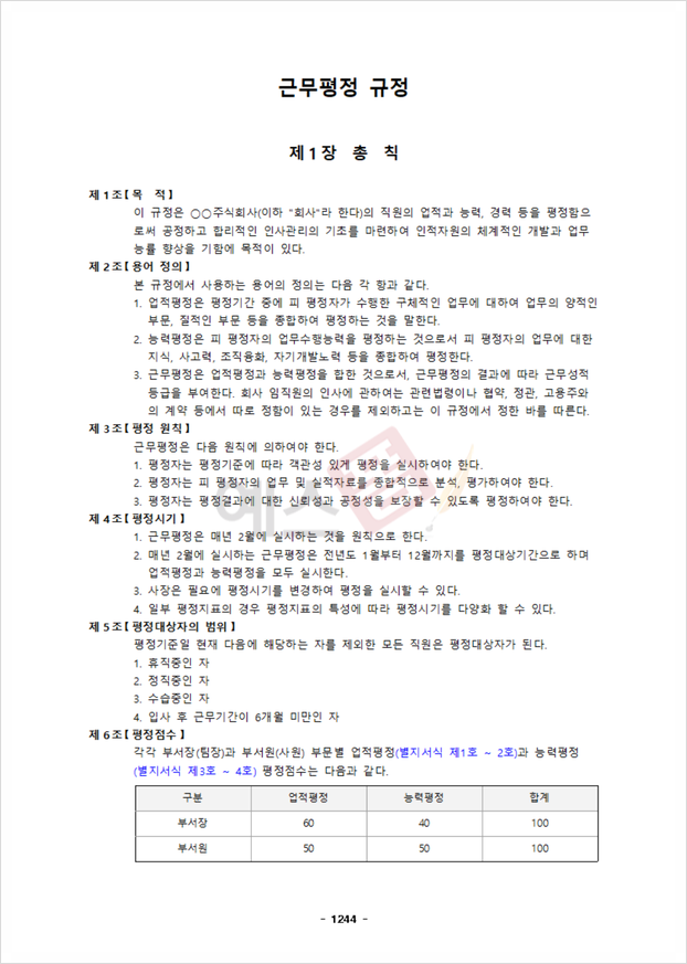 직원의 업적과 능력, 경력 등을 평정함으로써 공정하고 합리적인 인사관리의 기초를 마련한 근무평정 규정입니다.