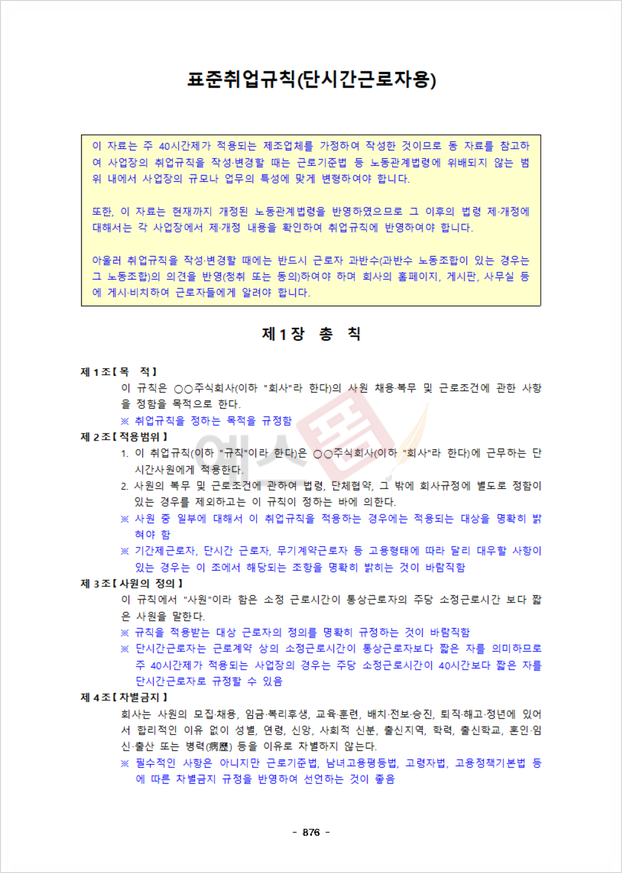 소정 근로시간이 통상근로자의 주당 소정근로시간 보다 짧은 단시간 근로자에 적용되는 표준 취업규칙입니다.