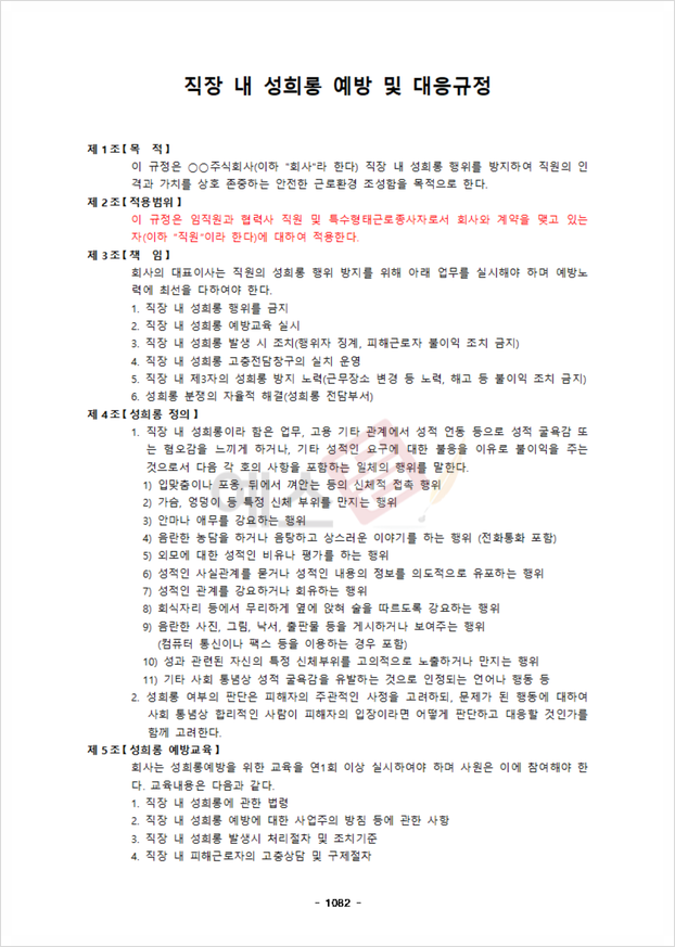 직원의 인격과 가치를 상호 존중하는 안전한 근로환경을 조성하기 위한 직장 내 성희롱, 괴롭힘 예방 및 대응규정입니다.