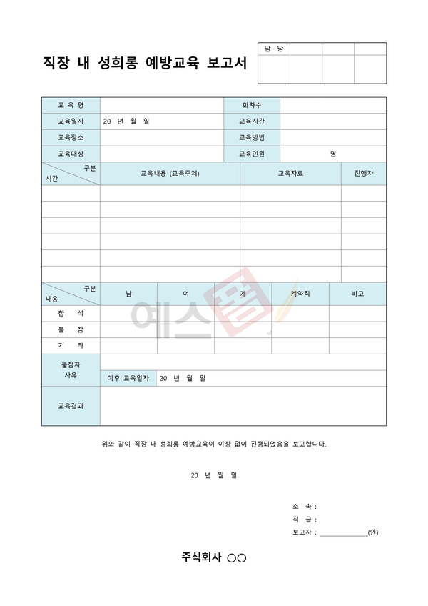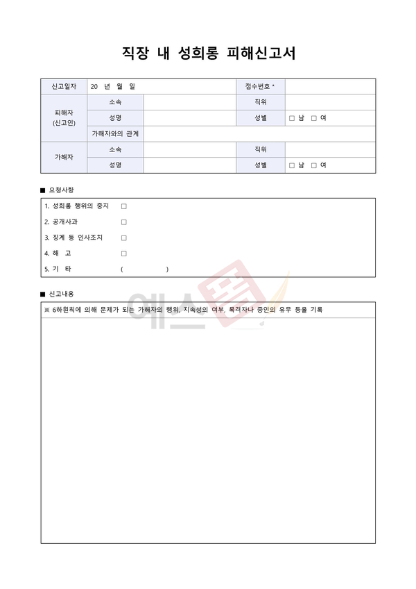 | 직장 내 괴롭힘 상담일지 | 직장 내 성희롱 피해신고서 | 직장 내 성희롱 예방교육 보고서 |