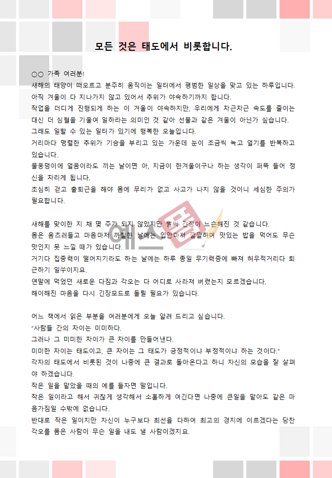1월 신년인사말 대표이사 직원 새해인사말 2026년 샘플 양식입니다. 모든 것이 태도에서 비롯한다는 내용의 대표이사가 보내는 1월 인사말 입니다.