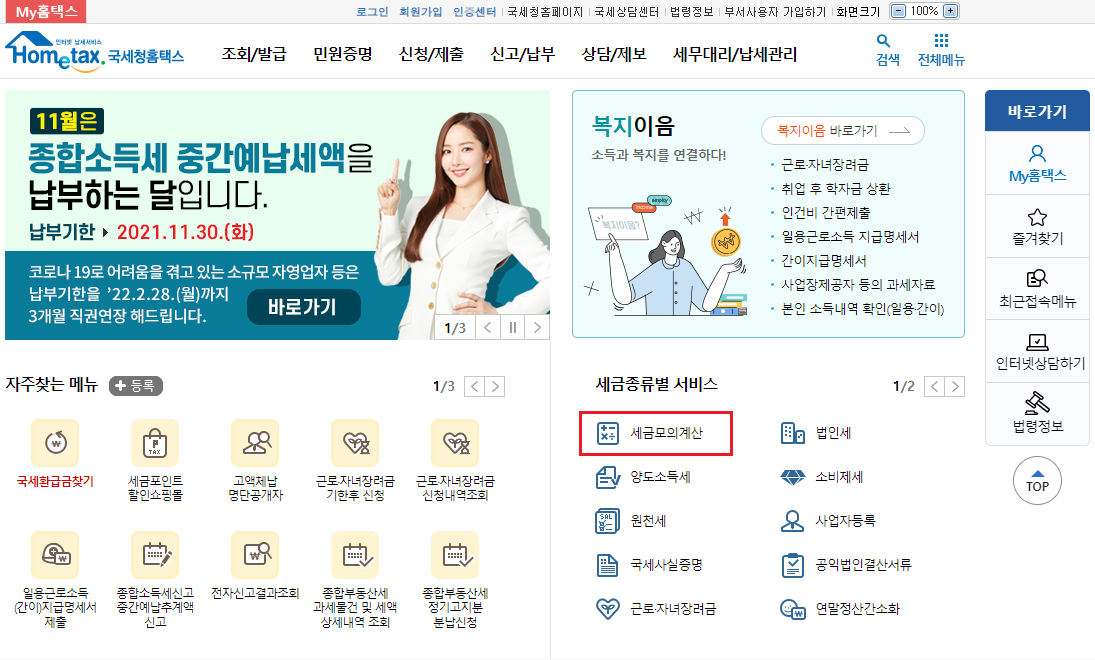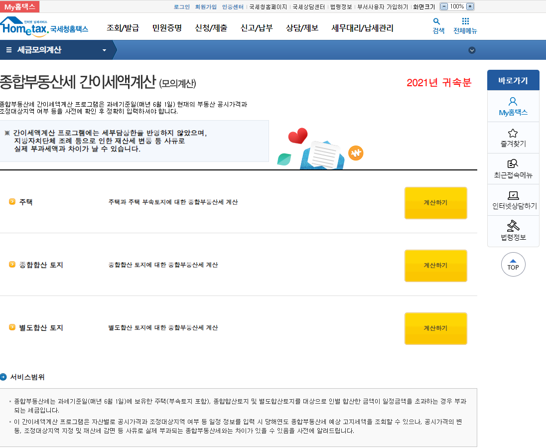 계산식을 봐도 이게 무슨 말인지 이해하기가 어려우실 텐데요. 그런 분들을 위해 국세청홈택스에서 세금모의계산 서비스를 제공하고 있으니 아래 링크를 통해 내가 납부해야 할 종부세를 직접 계산해 보시기 바랍니다. 다만, 공시가격의 변동, 조정 대상 지역 지정, 재산세 감면 등으로 실제 부과되는 종합부동산세와 차이가 있을 수 있습니다.