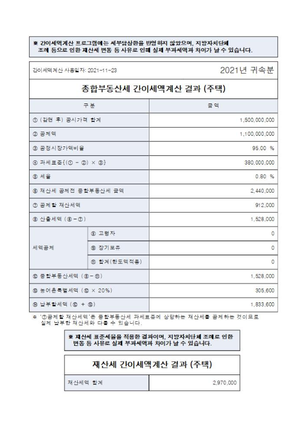 ⓑ 종합부동산 세액 - 공제할 재산세액 = ⓒ 산출세액