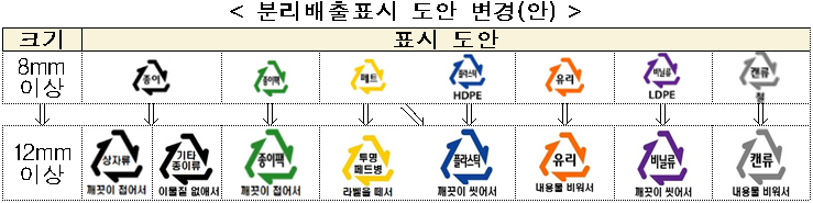아직 확정된 것은 아니지만, 분리배출 표시 심벌 크기를 키우고 분리배출 방법을 표기하는 안이 논의 중이며 관련 업계와 기관의 의견을 수렴한 후 개정안을 최종 확정할 계획이라고 합니다.