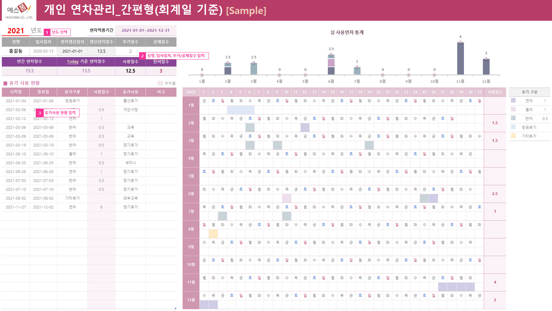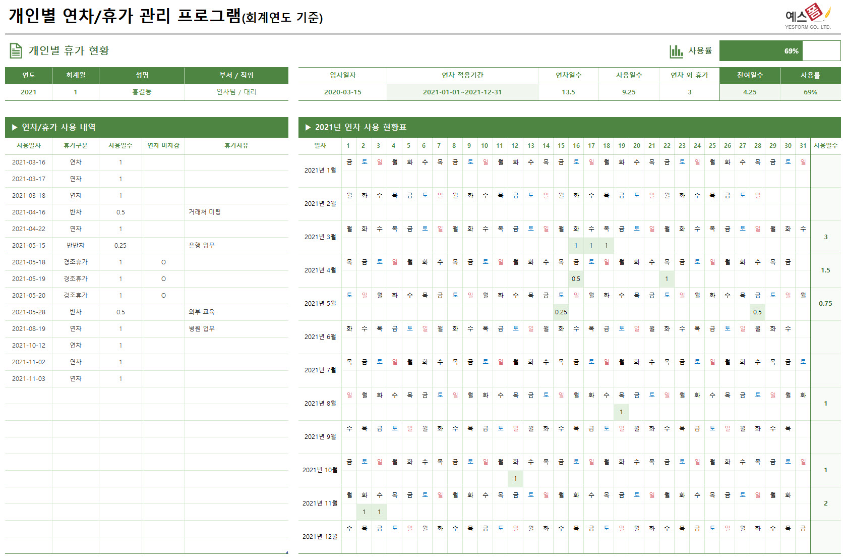 | 연차휴가 관리 프로그램(회계연도 기준) | 개인 연차관리_간편형(회계일 기준) | 개인별 연차휴가 관리(회계일 기준) |
