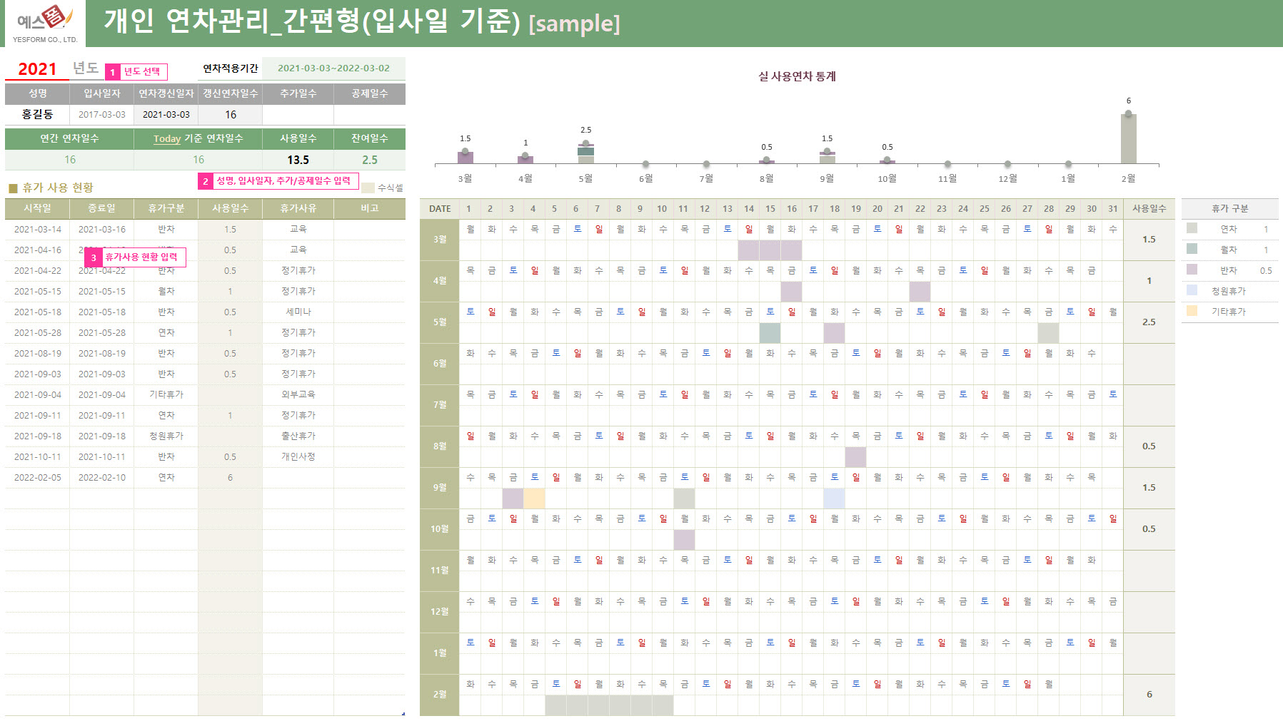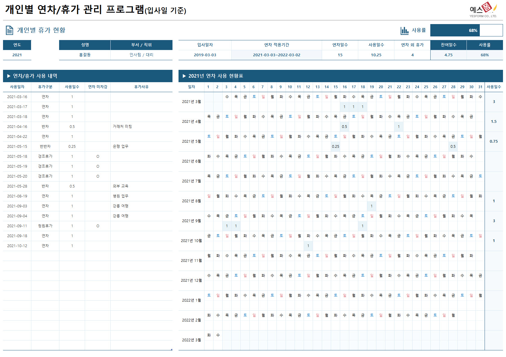 | 연차휴가 관리 프로그램(입사일 기준) | 개인 연차관리_간편형(입사일 기준) | 개인별 연차휴가 관리(입사일 기준) |