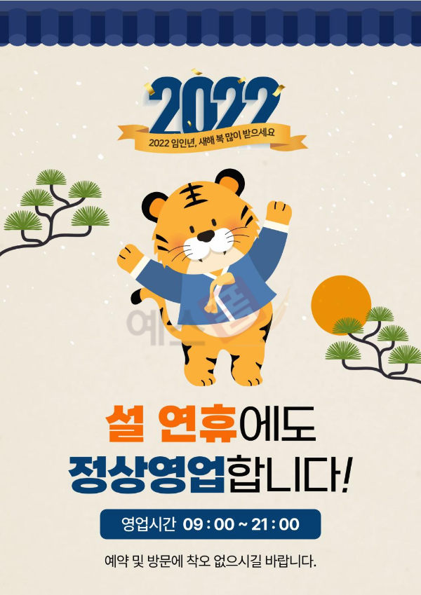 이에 예스폼에서 설날 택배 배송 마감이나 상담 업무 일정, 정상 영업 등을 알리는 2022년 설날 연휴 안내문 샘플을 준비했습니다! 아래 안내문 샘플들을 활용하셔서 즐거운 설 연휴를 맞이하시기 바랍니다.