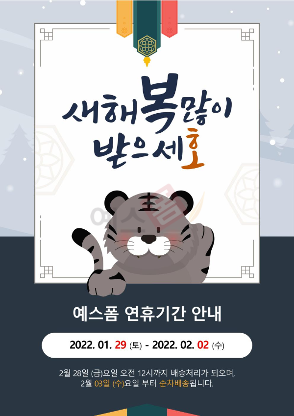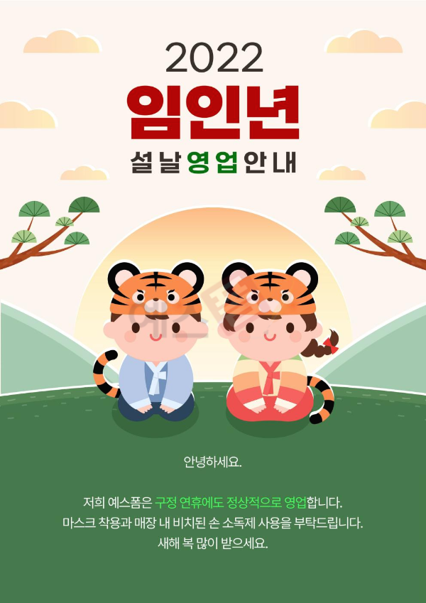 이에 예스폼에서 설날 택배 배송 마감이나 상담 업무 일정, 정상 영업 등을 알리는 2022년 설날 연휴 안내문 샘플을 준비했습니다! 아래 안내문 샘플들을 활용하셔서 즐거운 설 연휴를 맞이하시기 바랍니다.