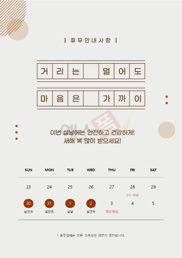 설 연휴가 오기 전에 휴무 기간을 알리는 안내문 양식입니다.
