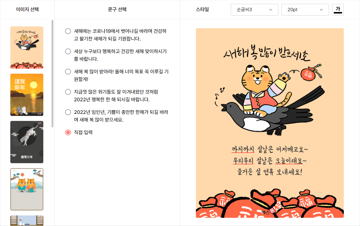 문구와 폰트까지 선택할 수 있는 인사말 카드 만들기를