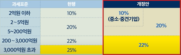 법인세 최고세율을 현행 25%에서 22%로 인하 예정입니다. 더불어 중소/중견기업은 과세표준 5억 원까지 10% 특례세율을 적용할 예정입니다.
