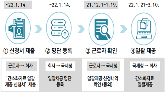 간소화자료 일괄제공 서비스를 이용하려면 회사에서 근로자의 신청을 받아 2022년 1월 14일까지 홈택스에 등록하여야 합니다.
