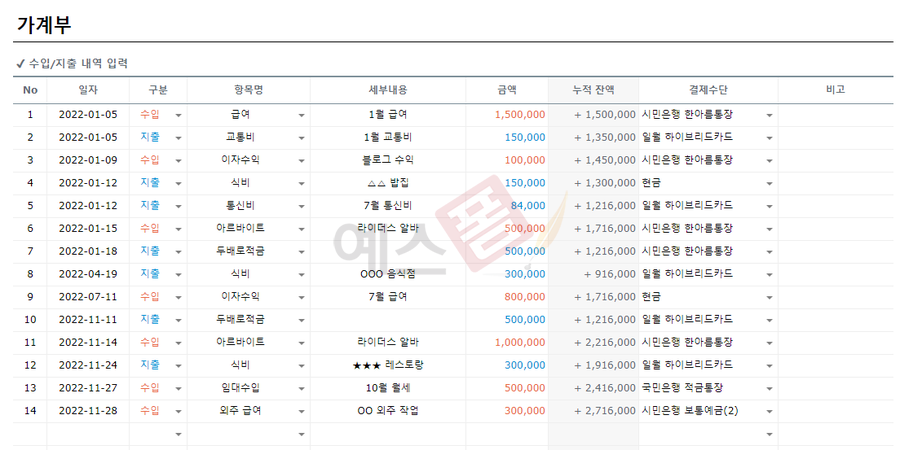 가계부 관리대장 구글 스프레드시트 - 예스폼 엑셀서식