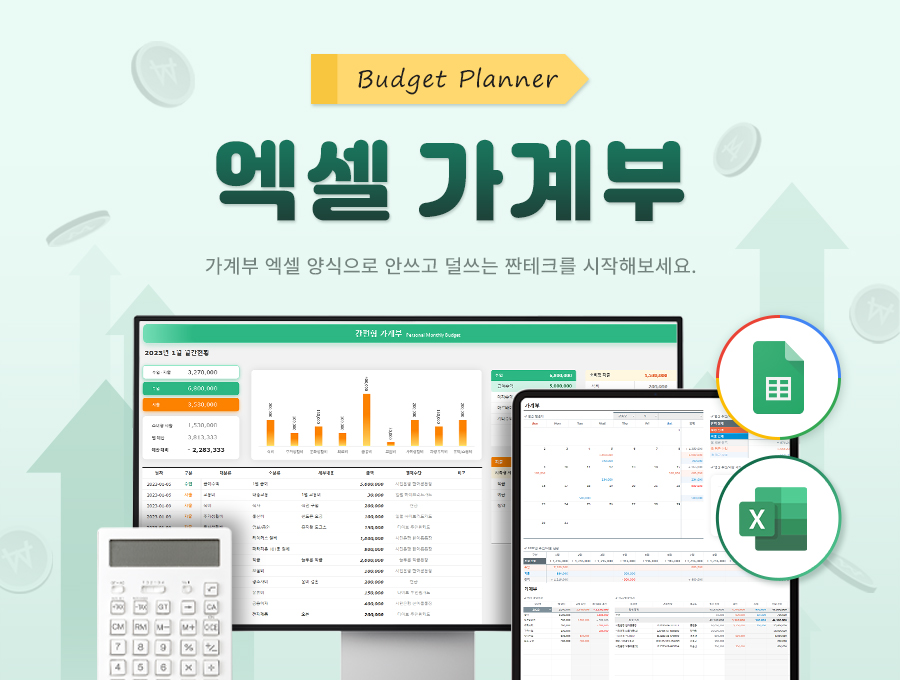 가계부 관리대장은 현금/통장 · 카드 · 고정지출을 관리할 수 있으며, 수입/지출 내역을 바탕으로 가계부를 편리하게 관리할 수 있는 구글 스프레드시트입니다. 이와 함께 월간 캘린더와 연간(