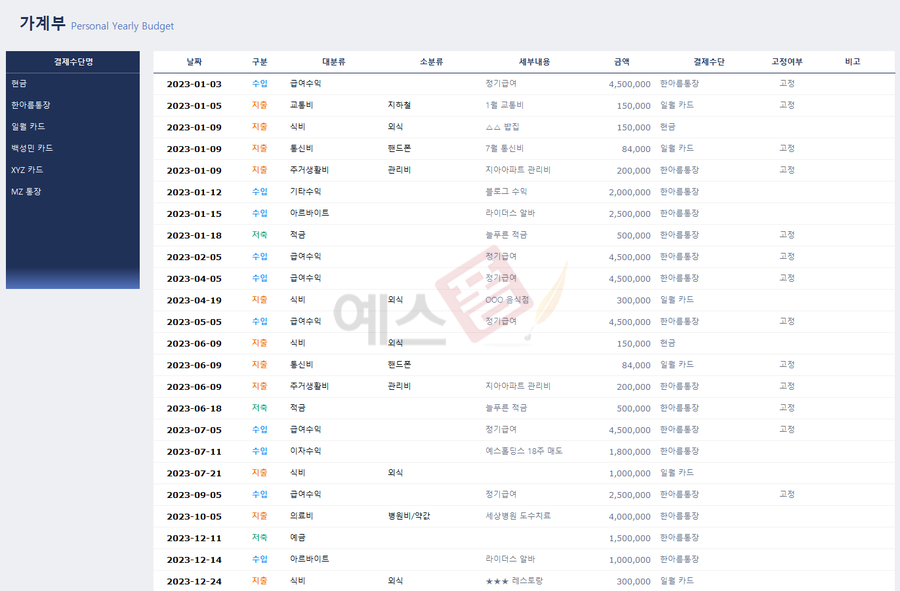 가계부 관리대장 구글 스프레드시트 - 예스폼 엑셀서식