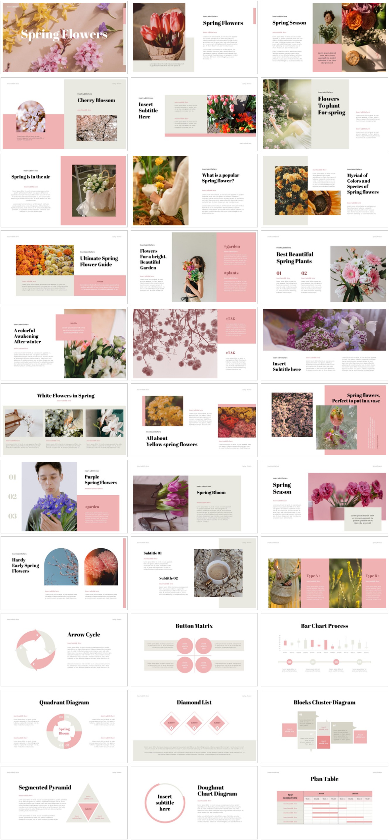 따뜻하고 사랑스러운 느낌의 봄꽃 템플릿입니다. 35 Slides로 구성되었습니다. 슬라이드, 다이어그램, 차트들이 한 세트로 구성된 파워포인트 템플릿입니다.