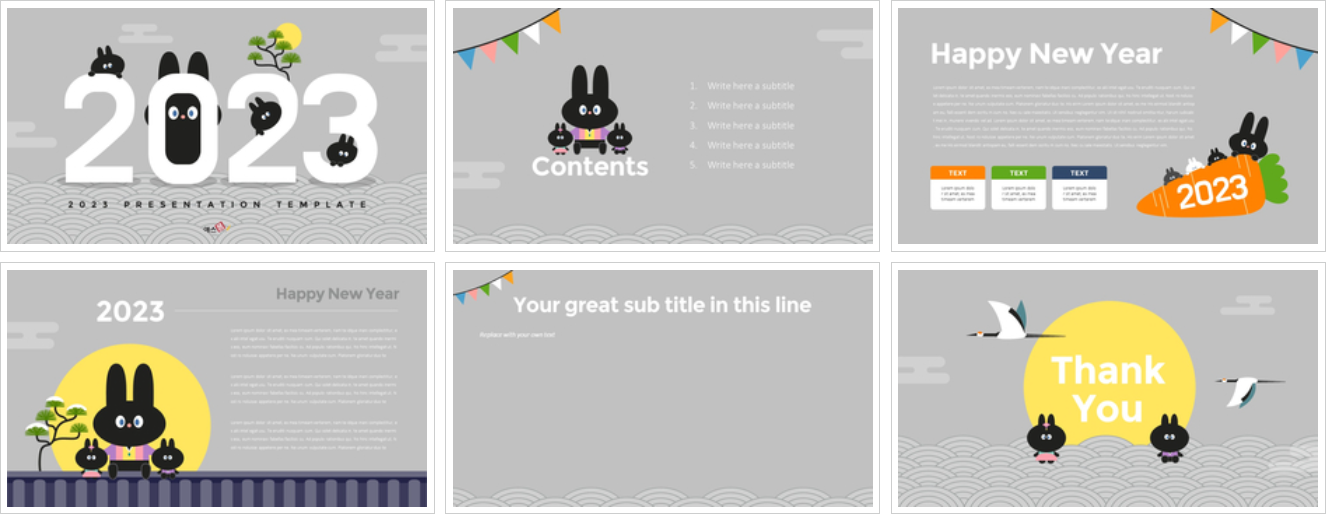 2023년 새해를 주제로 제작된 파워포인트 배경 템플릿입니다. 검은 토끼 관련 일러스트 이미지가 포함되어 있어 2023년 새해에 활용하기 좋은 템플릿입니다. 6장의 슬라이드로 표지, 목차, 내지, 종지로 서비스되고 있습니다.