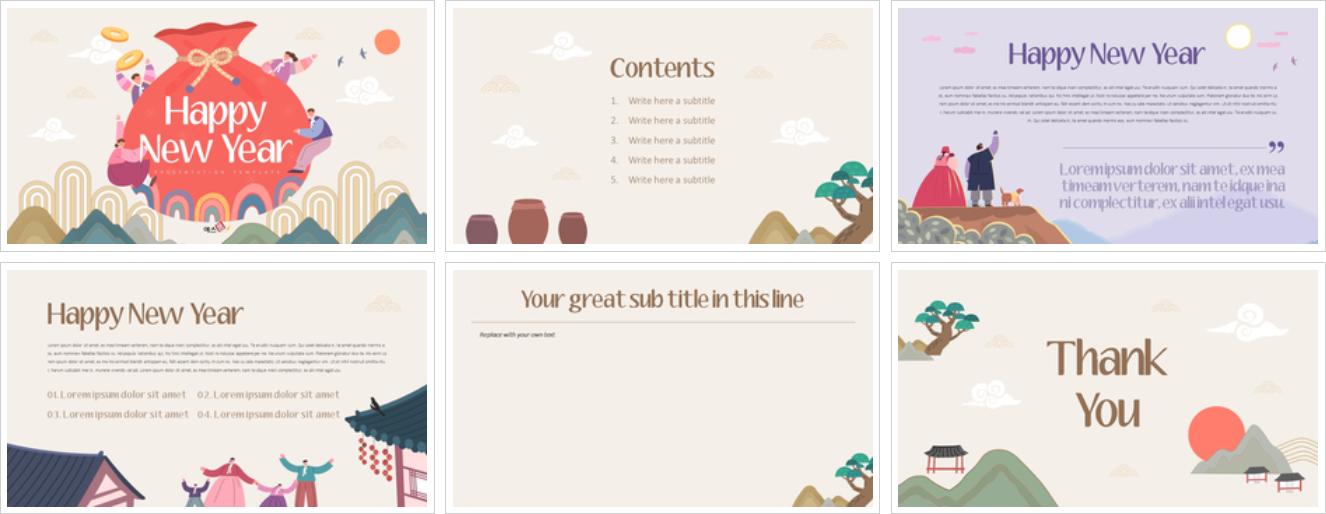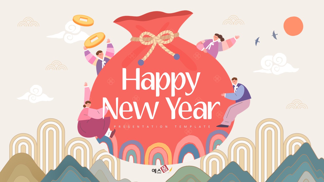 새해를 주제로 제작된 파워포인트 배경 템플릿입니다. 복주머니, 한복, 한옥 등 전통적인 일러스트를 배경으로 새해 덕담을 적기 좋게 제작된 템플릿입니다. 슬라이드 배경이나 폰트 색상을 변경하여 활용해보시기 바랍니다.