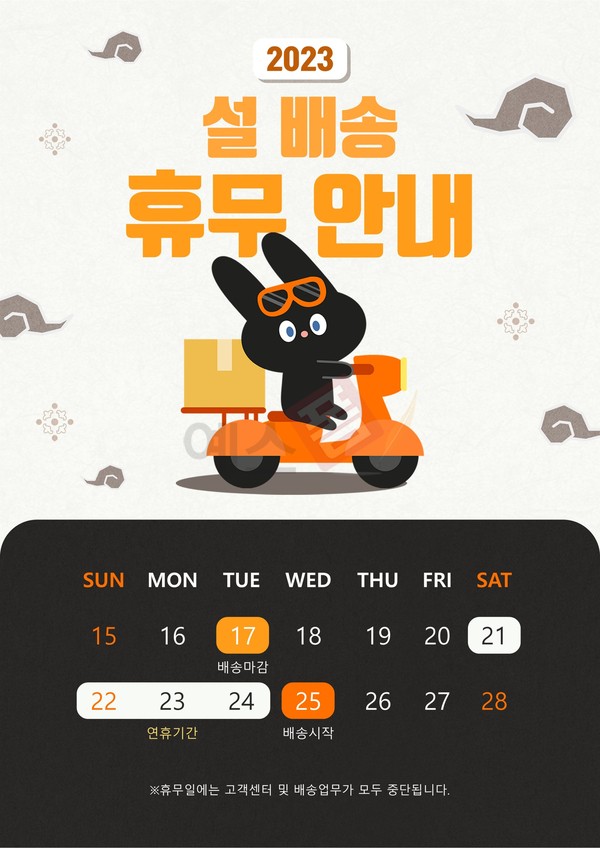 | 2023년 설날 연휴 휴무 안내문 (배송) | 2023년 설날 연휴 휴무 안내문 (연휴 기간) |