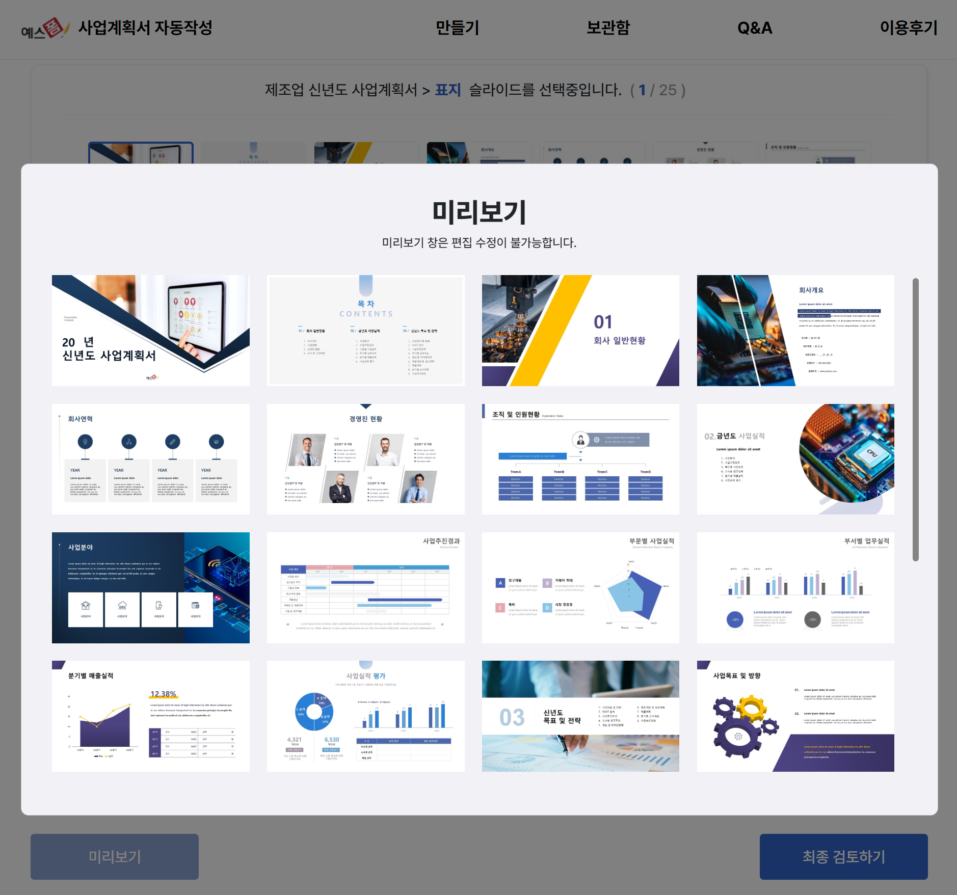 신년도 사업계획서의 목차를 따라 우리 회사의 사업에 맞는 템플릿을 골라보세요.