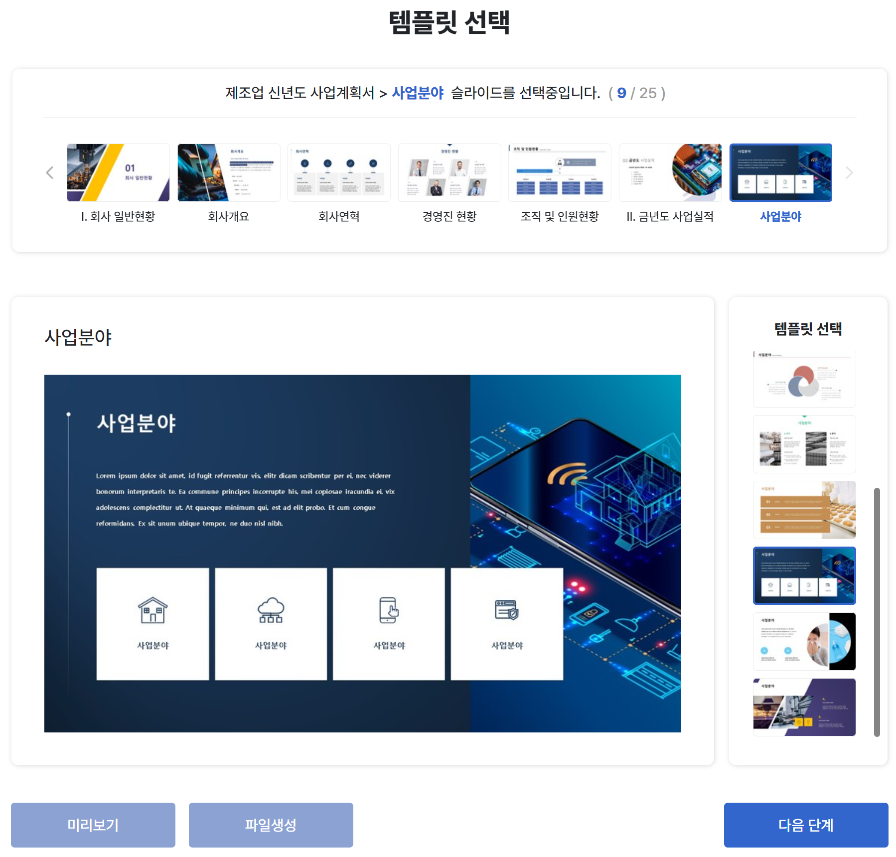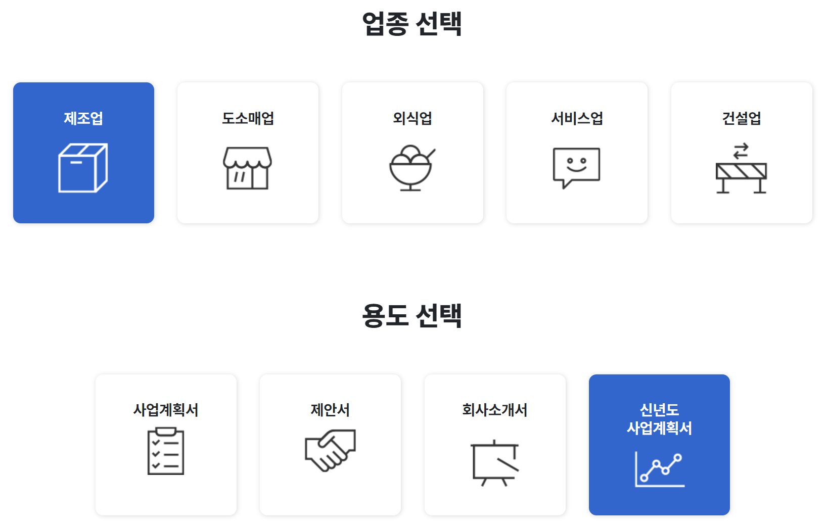 우리 회사에 맞는 업종을 선택합니다. 작성 용도는 신년도 사업계획서를 선택해주세요!